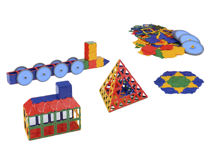 Состав набора: 80 цельных квадратов, 100 цельных равносторонних треугольников, 80 рамок квадратов, 160 рамок равносторонних треугольников, 12 колес, 12 осевых опор и 12 осей.