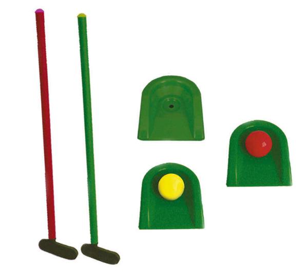В наборе: 2 клюшки, 2 мячика, 3 лунки.