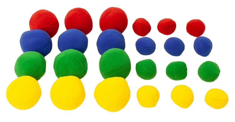 Комплектация: мячики мякиши - 2-х размеров 4-х цветов по 3 штуки каждого вида. Всего 24 штуки. Мешок для хранения - 1 штука.