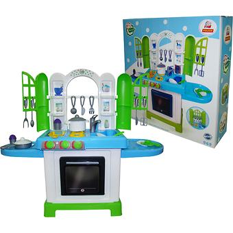 Набор включает компактную плиту с удобной рабочей поверхностью, мойку, полочки для хранения продуктов и разнообразную посуду на все случаи жизни (тарелки, чашки, блюдца, ножи, вилки, ложки, сковородки и пр.).