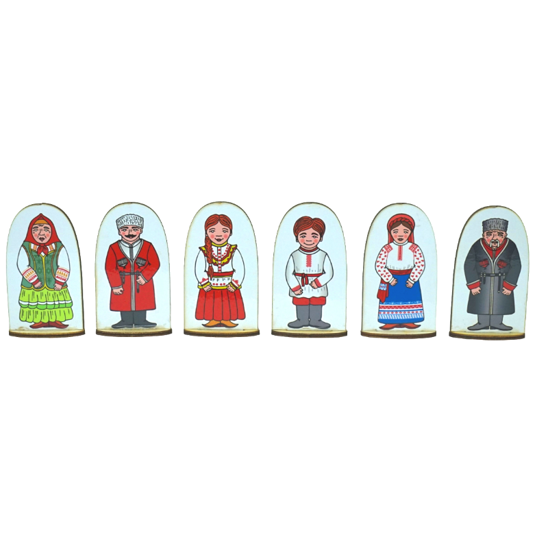 Набор кукол на подставке выполнен из фанеры с изображенными членами семьи казаков в народных костюмах: дедушка, бабушка, папа, мама, мальчик, девочка.