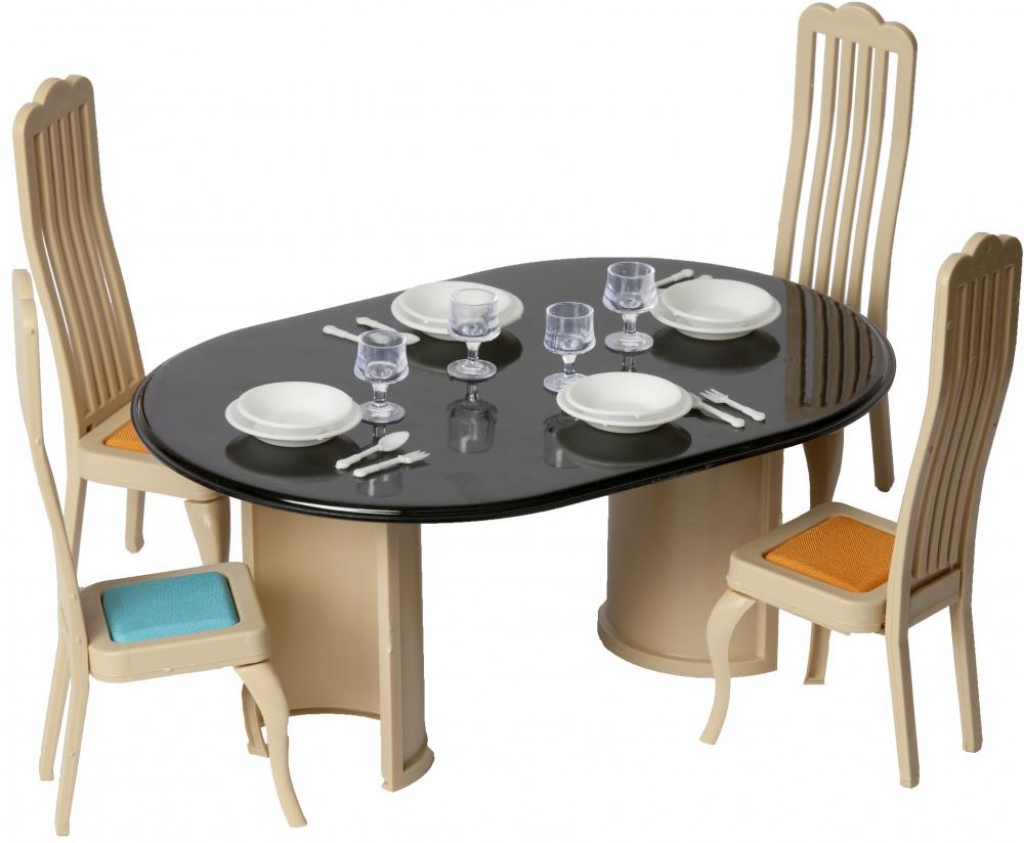 В комплект игрушки входят: Крышка стола - 1 шт., Стойка стола - 2 шт., Спинка стула - 4 шт., Сиденье - 4 шт., Ножка стула - 8 шт., Бокалы - 4 шт., Тарелки глубокие - 4 шт., Тарелки мелкие - 4 шт., Ложки - 4 шт., Вилки - 4 шт. Набор мебели "Столовая" предназначен для игр с куклами около 20 см.