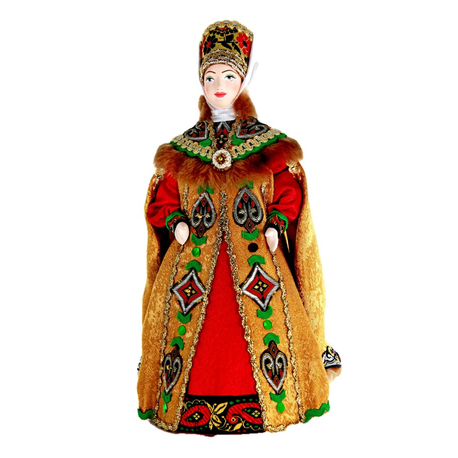 Кукла является изображением боярыни в русском национальном костюме, в состав которого выходит: головной убор, сарафан и телогрея, украшенная тесьмой и искусственным мехом.