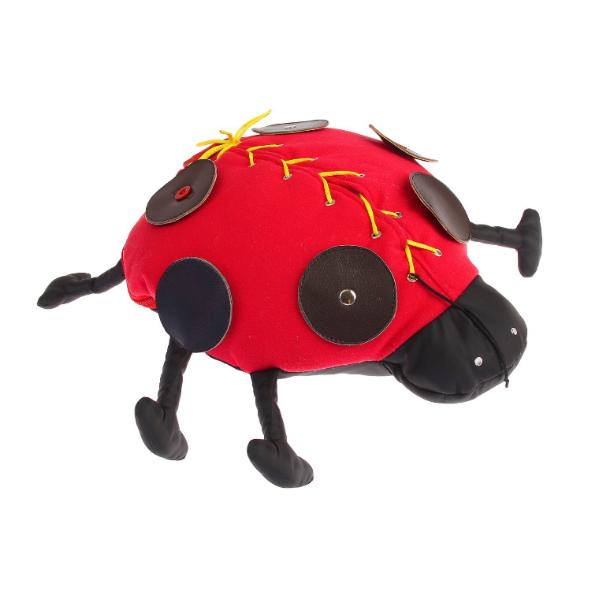 Божья коровка сшита из разноцветных сегментов, каждый из которых представляет какую-нибудь застежку: это и пуговицы, и шнуровка, и липучка.