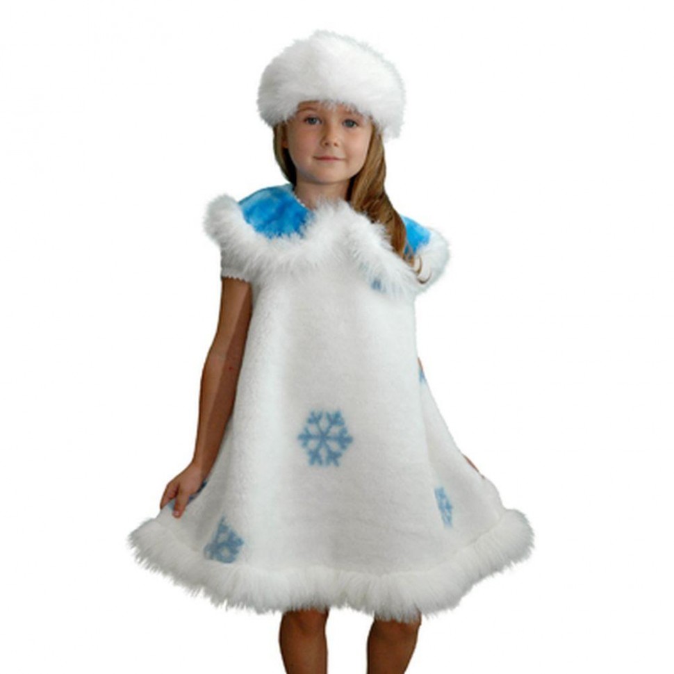 Платье белого цвета, украшенное синими фигурными снежинками оторочено искусственным пушком, который очень подходит по стилю к шапочке - такой же воздушной.